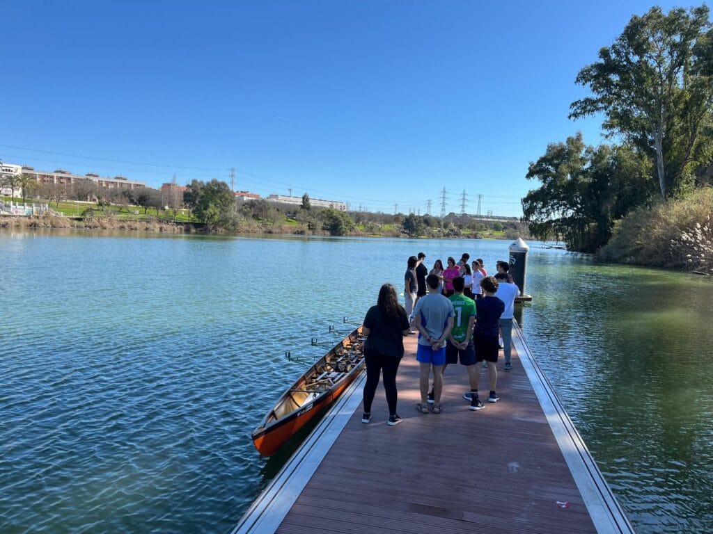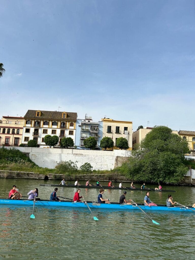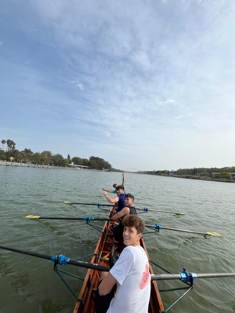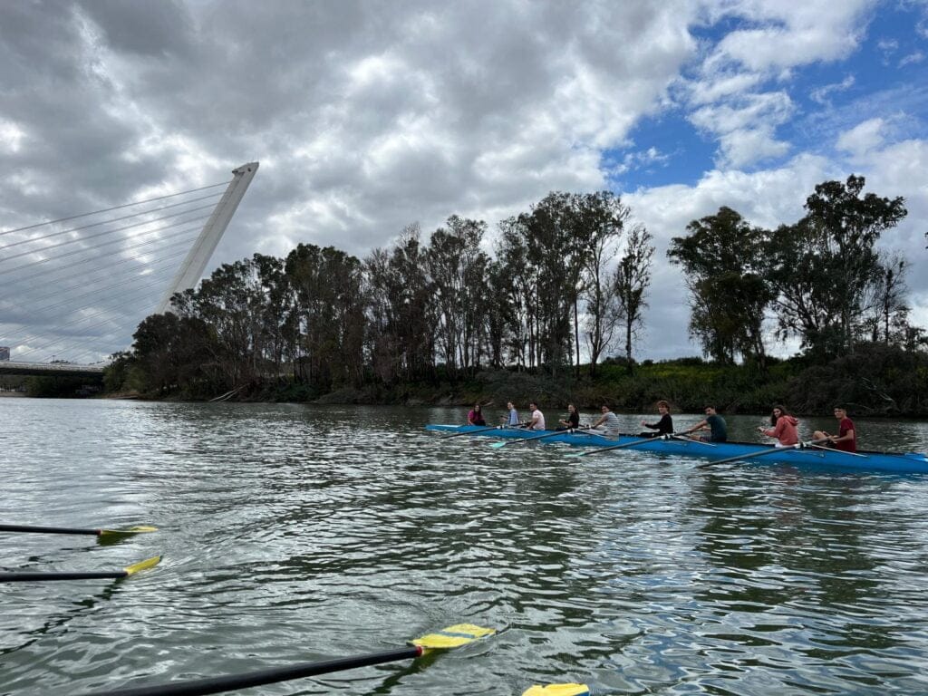 Remamos a lo largo del río Guadalquivir y cuando llegamos al Náutico, desayunamos allí, visitamos el club y volvimos de vuelta remando hacia el club de remo San Jerónimo.