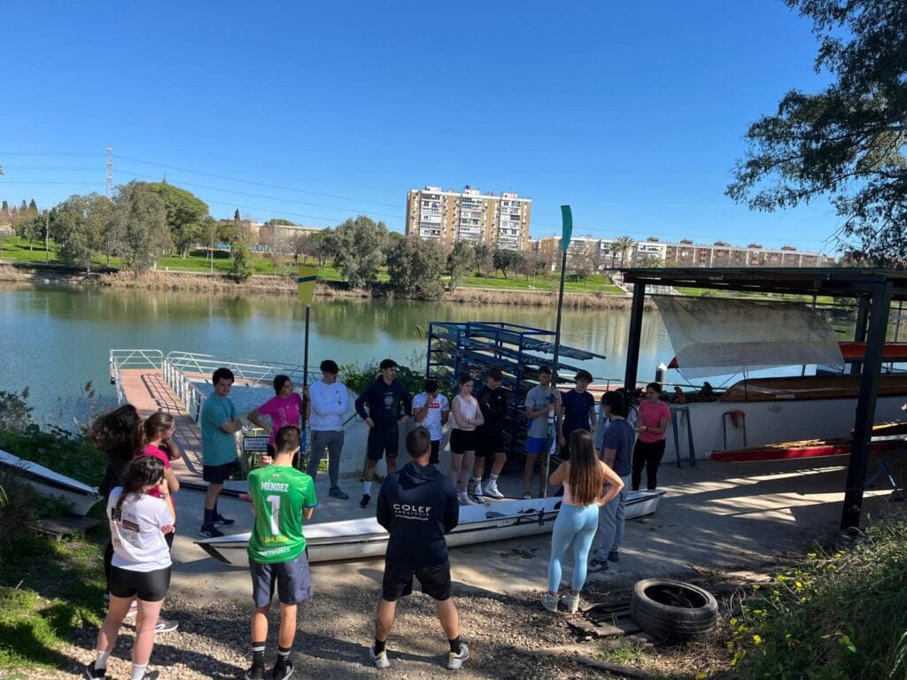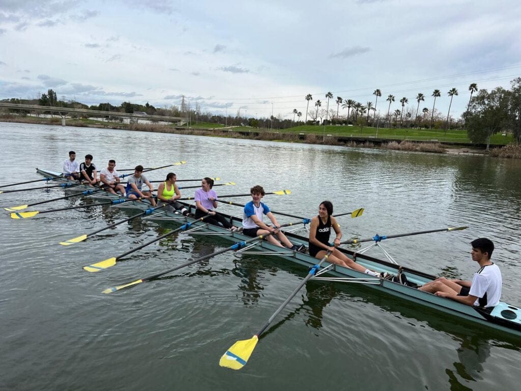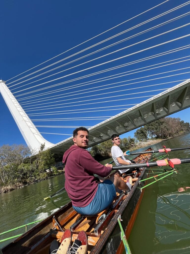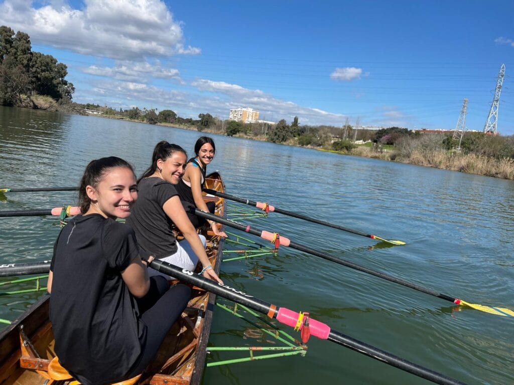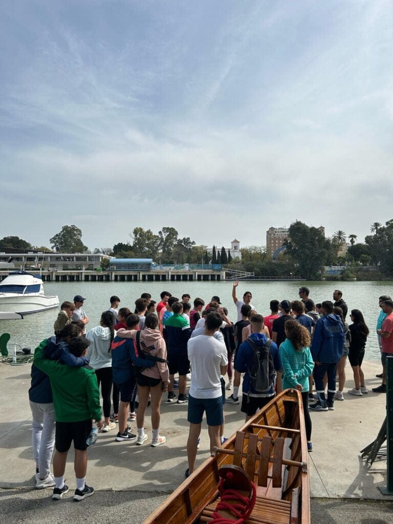 Remamos a lo largo del río Guadalquivir y cuando llegamos al Náutico, desayunamos allí, visitamos el club y volvimos de vuelta remando hacia el club de remo San Jerónimo.